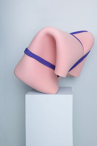 There is a fragmentation of the body in Lal’s images that draws the viewer into an emotional intimacy with her subject. It is as though, for Lal, the fragmented female body can be arranged like the formal elements in an Ikebana flower arrangement. William A Ewing notes in a 2000 publication, The Century of the Body that with the technological advancements of the early twentieth century camera, photographers settled upon the fragmentation of the body as a visual vocabulary of form. Viewing the body close-up or in part has become part of the lexicon of lens-based images as forms are cropped by the limitations of the viewfinder. The fragmented body becomes an intriguing puzzle piece to reading an image: a formalist, surrealist, realist or literal fragment (Ewing p20). In Lal’s photographs the female form is fragmented by clothing, props or set. Her model’s poses are athletic with limbs twisted in ways associated with yoga or gymnastics. Coupled with her images of bounded fabric forms on plinths, the female body appears subtly constrained, despite the formal signals of playful freedom employed in the choice of colour and nudity.