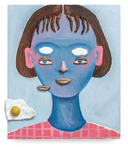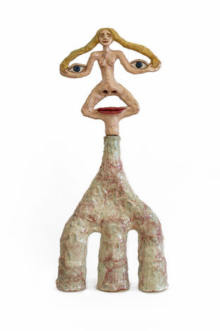 The marriage of the two practices creates the sense that one is in the studio with the artist, playing, experimenting, following one’s nose from one image to another. There are few rules: a clay nose can be worn as a barrette; a clay mouth can be fashioned into a third eye; a face can wear a message as a mask. There is a childlike playfulness to this process. And yet the resulting works never feel silly. In fact, they are rather contemplative—not comic, but melancholy. Overall, it is this ability to combine playfulness with seriousness that is characteristic of Steyn’s work.