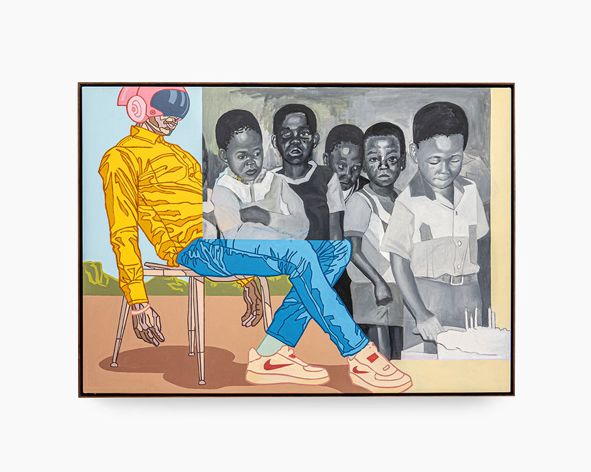 Known for bold, colourful illustrative designs that are re-imagining the future of Ditema, a traditional mural art in Basotho culture, Tjeko has went on to develop a new visual language that fuses a variety of styles to create compelling collage paintings and works on paper. With underlying themes of history, memory, and human interaction, Baba Tjeko’s work challenges modern society’s values and invites reflection on our place in the digital era. In 2025, Tjeko presented new works in an Artist Room at SMAC Gallery, Cape Town, South Africa; with a group presentation at Art Basel Miami (SMAC), Miami, USA.