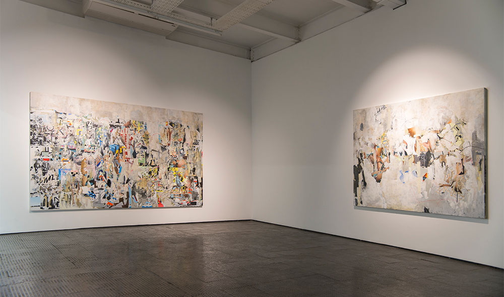 The bewildering experience of viewing the densely occupied surfaces prompts the viewer to experience a dislocated reality, better understood by means of cropping rather than attempting to decode the paintings as a unified whole. The binary logic and concept of the work is discovered in fragments, an experience similar to reading online – or viewing a map.