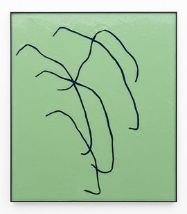 Along with the near-literal naturescapes and the stick works that they inspired, there are four abstract paintings of isolated lines reflecting the shapes of branches drawn elsewhere in the show. The sticks used to create the lines are shaped like the lines themselves. The sticks are the lines themselves, creating yet another of Eastman’s many strange loops.