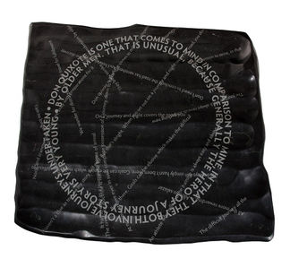 Conceptual artist, Willem Boshoff’s work, Writing Footprints II encapsulates the main themes of the exhibition. Boshoff’s own words, best describe the idea behind his sculpture made from the indigenously mined Belfast Black granite; “In life we travel constantly from place to place and from moment to moment… Almost all footprints vanish in time”. Boshoff fixes the traces of various journeys (footprints) in granite rock, so as to fossilize them and capture them in time.