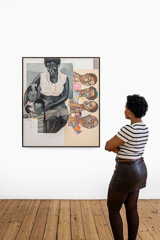 Tjeko’s complex compositions reflect a nuanced dialogue between heritage and contemporary modes of expression. His monochromatic portraiture evokes personal and communal memory, drawing from his working-class upbringing and emphasizing qualities of simplicity, kindness, love, and community—values he perceives as increasingly absent in a digitally mediated, image-conscious society. In his colourised works, Tjeko captures the stylized, digitized aesthetics of contemporary life while tracing an emotional lineage back to his home, honoring the shapes, colours, and traditions that inspire him.