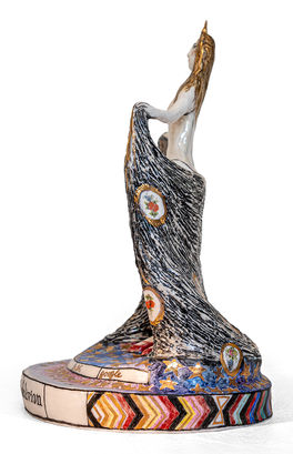 Giovanna Biallo has worked in both painting and sculpture since the mid-1990s. The two seemingly different directions in her practice have been shaped by influences and experiences as far removed from one another as Mark Rothko and the abstract colour fields, and Russian avant-garde artists reimaging bourgeois porcelain collectables into revolutionary storytelling for the masses. Yet, both are the result of a slow and painstaking process: of sculpting the canvas (or, at times, paper or gesso board) through meticulous mixing and applications of gradations of colour, and of moulding, assembling, and painting her porcelain sculptures with layers of applied hues and repeated firing. The exhibition brings together abstraction and figuration, exploration of colour as language and the delight in figurative detail – and the exuberance that characterises both bodies of work. My pieces always take a long time, explains the artist, both by choice and by necessity of porcelain making. Her paintings are equally absorbing, resulting in grids of endless colour variations exploring their potential to communicate with the viewer. In her sculpting process, she goes through several phases of hand modelling, cutting, carving, assembly and paint application for each piece. They require multiple firing sessions at temperatures as high 1300C between the different stages to achieve the richly coloured and robust form. The results are beguiling – the sculptures look like they belong to a different epoch, remnants of the world that is gone forever, shards of the past washed up on our shores, mythical protagonists of stories long forgotten. The artist interrupts our indulgence in nostalgia, however, sometimes adding a sprinkle of contemporary detail and sometimes, literally, planting the figurines into our contemporary world, referenced in their pedestals. It is this clash between the past, the comforting world of objects and the present defined through the intangible digital networks of words and images (“Subscribe”, “scrolling”, “Google”) that disrupts our perception. It creates a bit of welcome chaos in the world of magical porcelain brides and their shimmering veils, pitting them against rude (virtual) reality, while asking us to consider where they may belong. Or is this an invitation to consider where we belong in this brave new world? This question takes us back to one of the formative influences in Biallo’s sculpting practice. Coming across the book by Nina Lobanov-Rostovsky, Revolutionary Ceramics: Soviet porcelain 1917-1927, she was struck by how Russian avant-garde artists re-interpreted, re-appropriated and re-purposed the tradition of porcelain making, seen at the time as an attribute of bourgeois lifestyle and therefore belonging to the “dustbin of history”. Russian avant-garde largely embraced the revolution and answered the call to turn their art into the service of constructing the new world – they created designs for textiles, furniture, buildings and porcelain. Malevich, Popova, and Danko all contributed to the industrial revolutionary project. Some of their work introduced radical abstraction of form (famous tea sets and plates by Malevich), while others used the traditional and well-understood format of figurative porcelain to communicate and celebrate the new protagonists of history – soviet workers, revolutionary soldiers and everyday people making up the new ruling class, the proletariat. This reappropriation of the tradition was responsible for the survival and the thriving of porcelain production in post-revolutionary years – most soviet households had at least one of those figurines. Biallo found the story inspirational – she became interested in porcelain as a contemporary medium to communicate stories that interest her and to reflect on the world that we live in today. Some of the sculptures, Cubic I and Cubic II, reference this lesser-known chapter of the medium’s history more directly, through the geometric forms, while their surfaces are filled with references from the artist’s personal life and other contemporary motifs. Others seem to connect more directly with Biallo’s painting practice, echoing the grid and flowing patterns of her paintings on some of their painted surfaces. Together they provide a kaleidoscopic glimpse into Biallo’s universe, where abstract and figurative, old and new, magical and literal exist side by side, and where, at times, it feels like the painted surface might slip off one of her sculptures, like a shawl off a bride’s shoulder, and melt onto the canvas’s surface.