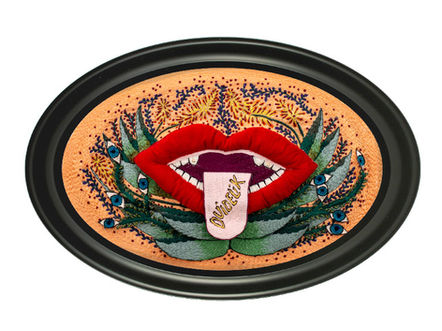 Jody Paulsen and Thania Petersen’s approach to tapestry is bright and florid. Their works can be read as contemporary rewritings of the canonical form, transforming and transfiguring scenes and still lifes in their own distinct styles. Gabrielle Kruger’s contributions have the volume and texture of the medium but are created with acrylic paint that has escaped the canvas. In this way, Kruger amalgamates fabric and acrylic to experiment with the true meaning of “tapestry.” Michaela Younge’s works, in their bold, unapologetic contemporary visions of detailed scenes, offer sarcastic and humorous alternatives to the canon. Sivan Zeffert has an interest in the ability of tapestry to stand alone and her hanging pieces declare the medium as independent and uncompromising; much like Sandy Harris, who toys with the notion of mimesis: form is explored through construction with cloth, replacing sturdier mediums such as wood. Le Riche, too, coalesces the borders between sculpture and tapestry, refusing to associate himself with a single medium.