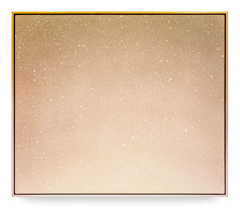Mudge’s observations from her fixation on the sun are poetically suggested in the song lyric titles of the works on display. They are drawn from the artist’s personal playlist of emotionally charged Millennial pop songs: Linkin Park, Muse, The Killers and the Strokes, to name a few. These songs epitomize an era of disquiet and foreboding from within a social system that feels like a cage, as described by The Offspring in Staring at the Sun (1998, Americana album). Mudge’s trademark glitter and enamel surfaces sparkle but with a lachrymose heartache as the artist makes peace with an understanding of inevitable change. This poetic melancholy is communicated through the subtle shifts in forms and colour throughout the works on display. Many of the strong phrases Mudge traditionally uses in her canvases are conspicuously missing in this body of work. They appear only in fragmented materials, as bead and chain works, at the entrances to the exhibition as if to iterate the terrain within the exhibition as one of liminal uncertainty.