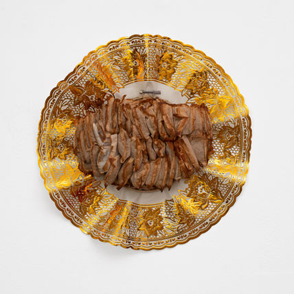 Jody Paulsen and Thania Petersen’s approach to tapestry is bright and florid. Their works can be read as contemporary rewritings of the canonical form, transforming and transfiguring scenes and still lifes in their own distinct styles. Gabrielle Kruger’s contributions have the volume and texture of the medium but are created with acrylic paint that has escaped the canvas. In this way, Kruger amalgamates fabric and acrylic to experiment with the true meaning of “tapestry.” Michaela Younge’s works, in their bold, unapologetic contemporary visions of detailed scenes, offer sarcastic and humorous alternatives to the canon. Sivan Zeffert has an interest in the ability of tapestry to stand alone and her hanging pieces declare the medium as independent and uncompromising; much like Sandy Harris, who toys with the notion of mimesis: form is explored through construction with cloth, replacing sturdier mediums such as wood. Le Riche, too, coalesces the borders between sculpture and tapestry, refusing to associate himself with a single medium.